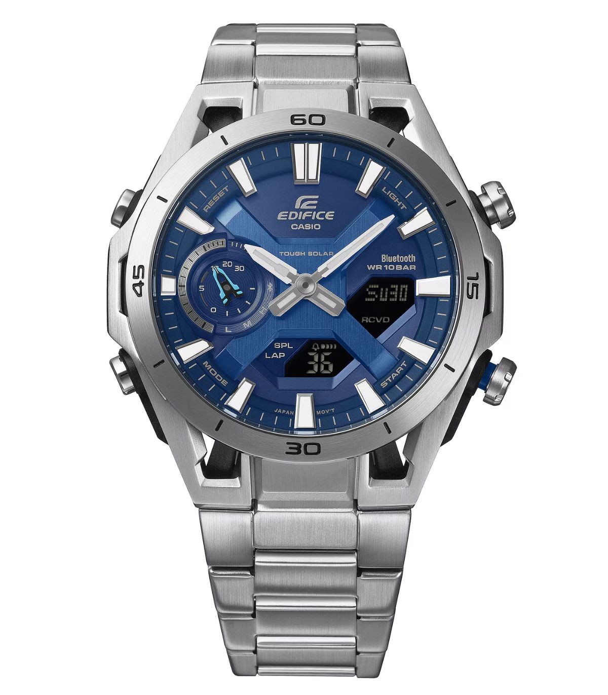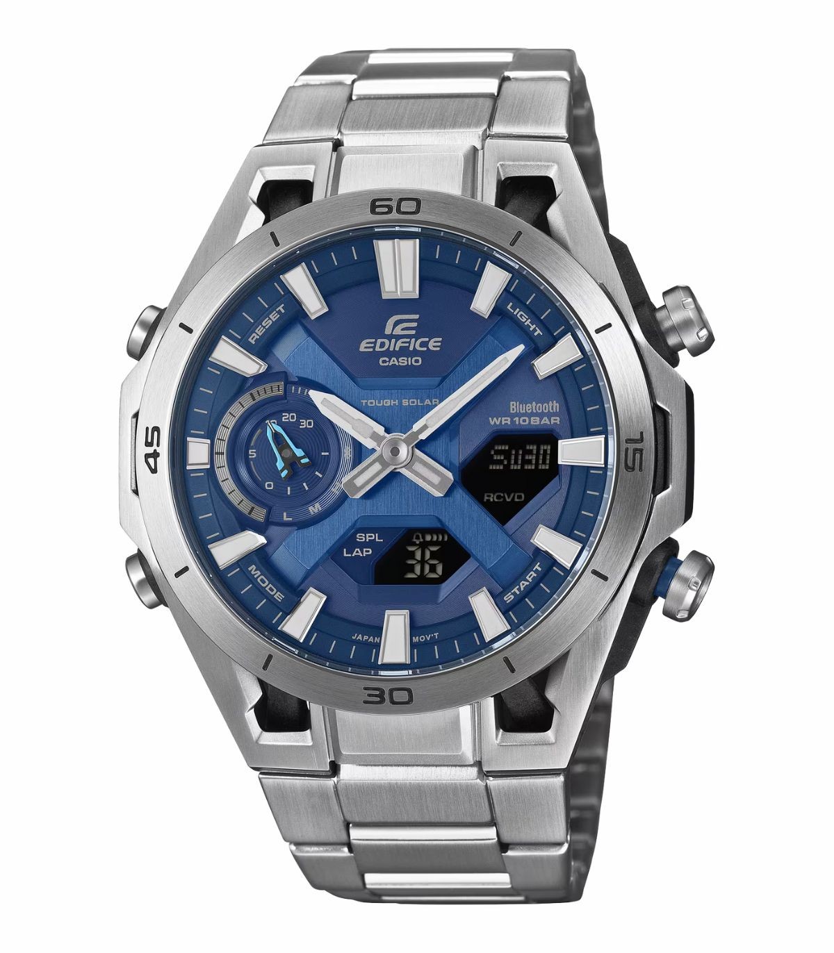 Orologio Casio Edifice ECB-2300D-1A Sospensione, caratterizzato da funzionalità avanzate e raffinatezza ispirate alla vera forma degli sport motoristici. La cassa combina la resina rinforzata con fibra di carbonio e l'acciaio inossidabile per garantire la leggerezza e l'elevata rigidità di di una macchina da corsa. Con un diametro inferiore di 2 mm rispetto al precedente offre un facile comfort quotidiano e una vestibilità più elegante. L'associazione degli smartphone tramite Bluetooth consente la correzione automatica dell'ora e semplifica la configurazione del promemoria sonoro, dell'ora internazionale e di altre funzioni dell'app.