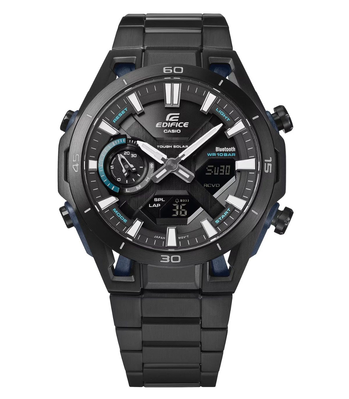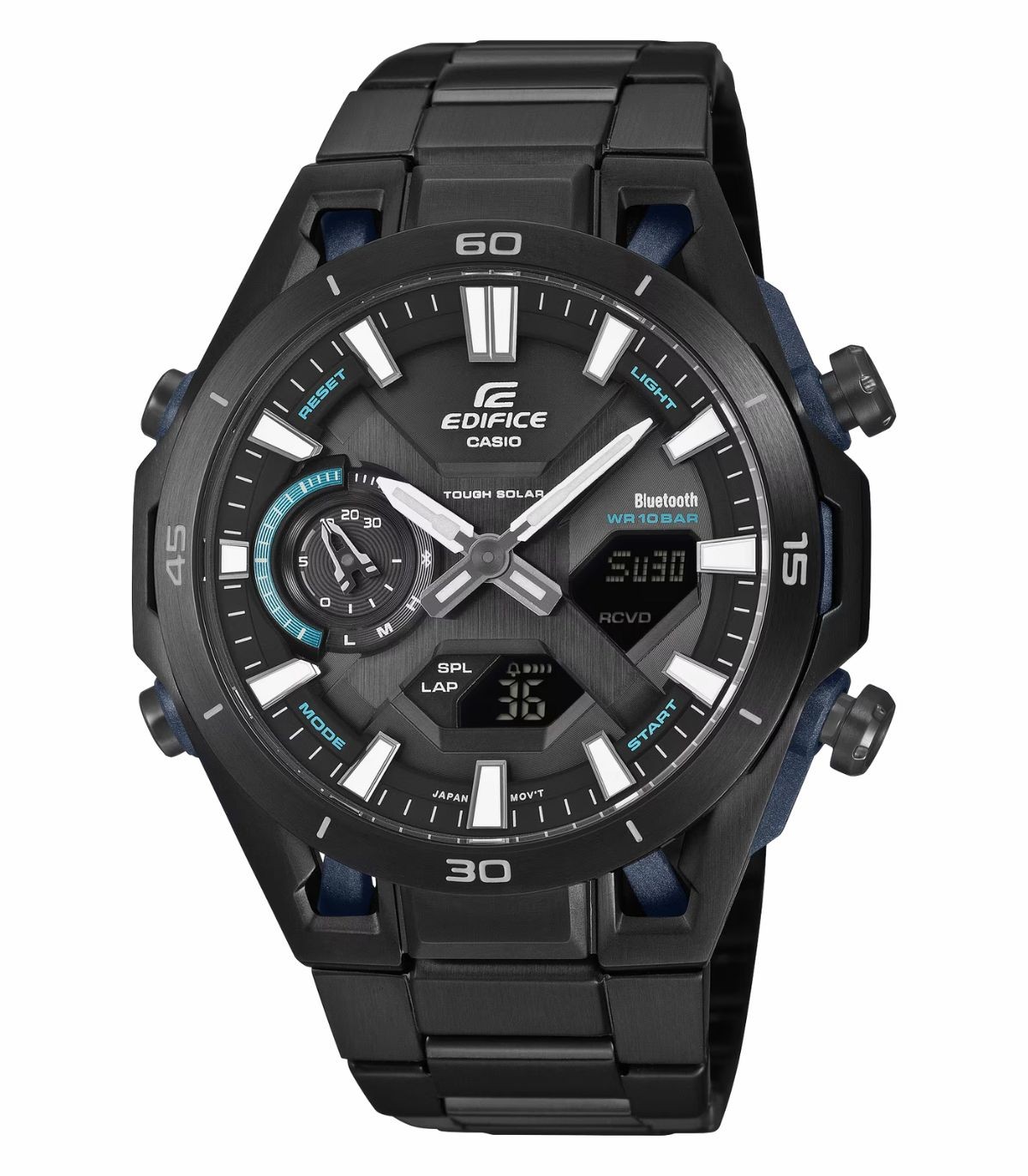 Orologio Casio Edifice ECB-2300D-1A Sospensione, caratterizzato da funzionalità avanzate e raffinatezza ispirate alla vera forma degli sport motoristici. La cassa combina la resina rinforzata con fibra di carbonio e l'acciaio inossidabile per garantire la leggerezza e l'elevata rigidità di di una macchina da corsa. Con un diametro inferiore di 2 mm rispetto al precedente offre un facile comfort quotidiano e una vestibilità più elegante. L'associazione degli smartphone tramite Bluetooth consente la correzione automatica dell'ora e semplifica la configurazione del promemoria sonoro, dell'ora internazionale e di altre funzioni dell'app.