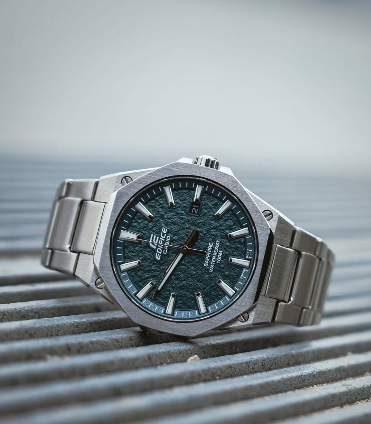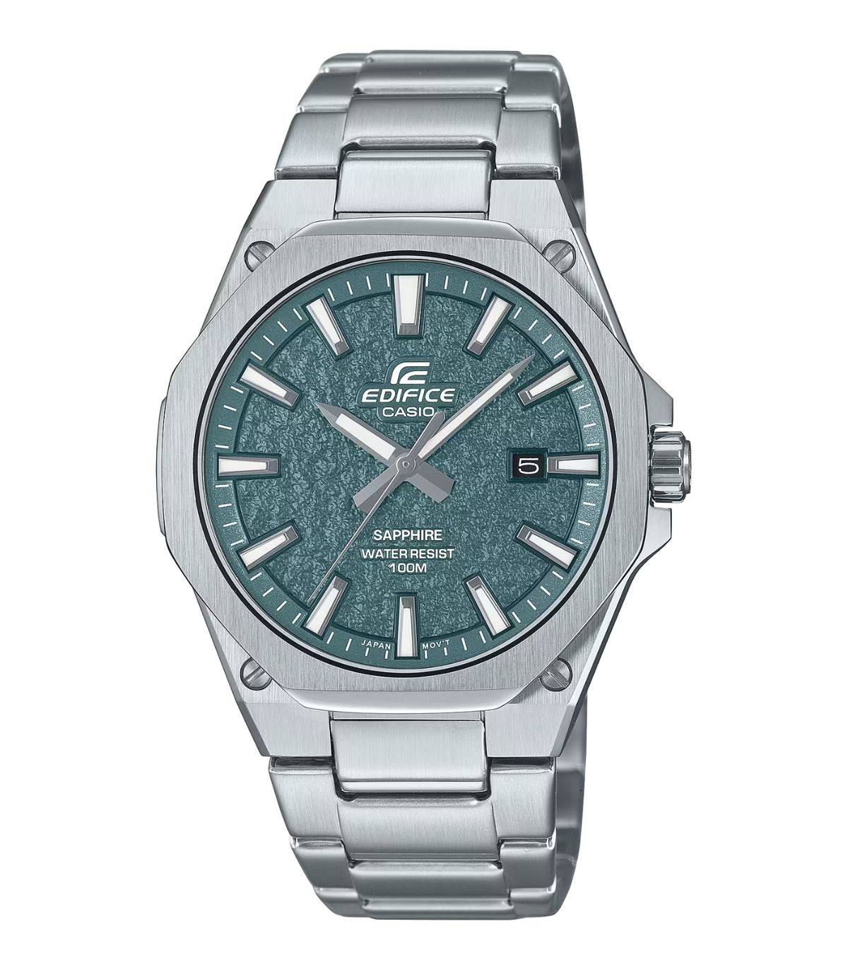 Orologio Analogico della linea Casio Edifice. Orologio con lunetta piatta ottagonale, cassa color verde e cinturino in acciaio inossidabile, chiusura one-touch 3 pieghe. Impermeabile fino a 10 atm. Cassa dal diametro di 39 mm e vetro zaffiro. Orologio con movimento al quarzo e datario a ore 3.