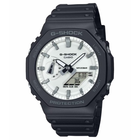 Il modello GA-2100 digitale offre pratiche funzioni come l'ora internazionale e il cronometro, una luce LED ad alta luminosità. Questo modello presenta cassa e cinturino matte e un quadrante luminoso rifinito con una deposizione di vapore color bianco brillante.