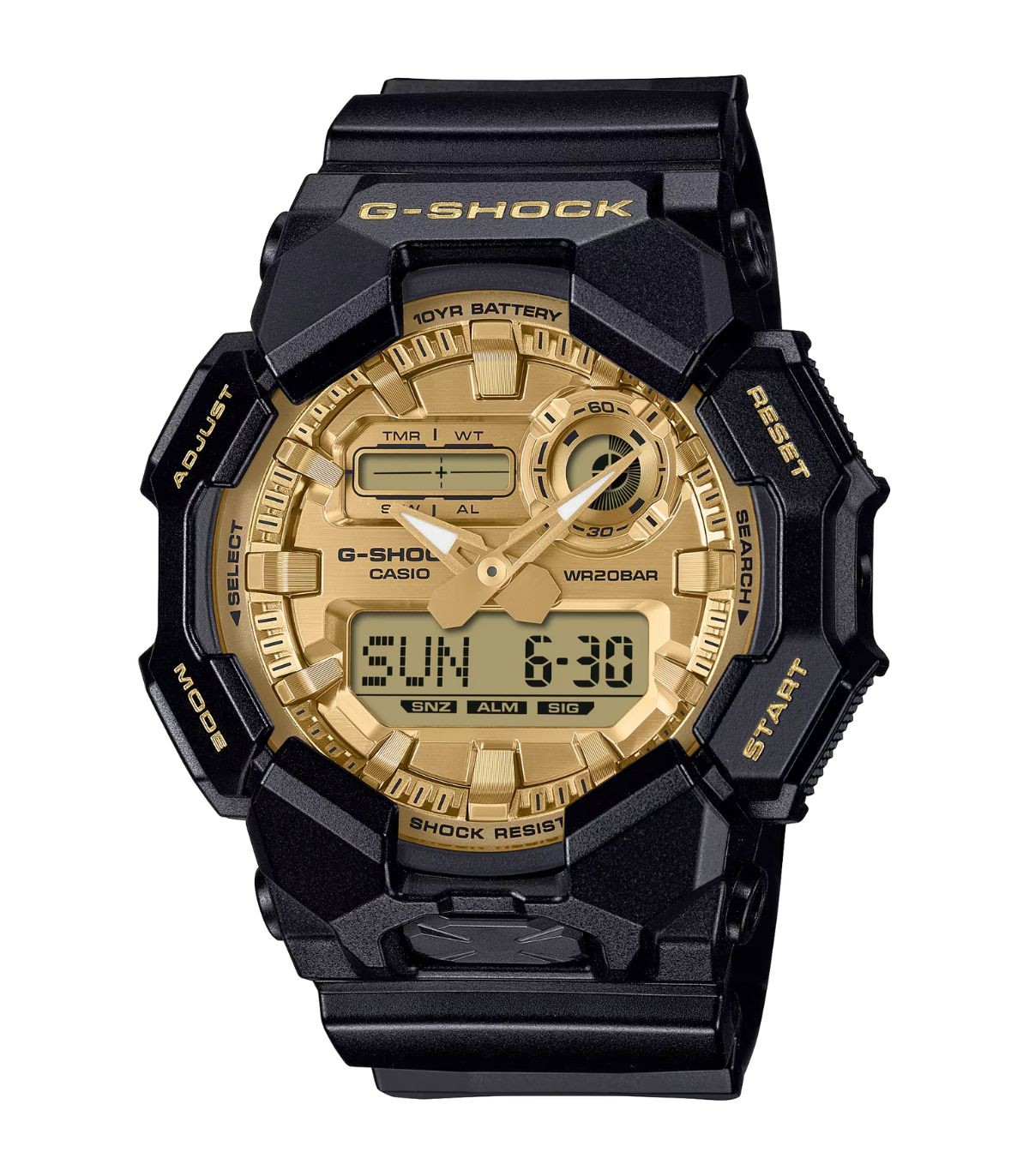 Questo modello analogico-digitale è caratterizzato da un colore nero e un quadrante dorato. La cassa e il cinturino sono rifiniti con un rivestimento lucido per un look elegante e brillante. L'orologio offre pratiche funzioni come l'ora internazionale e il cronometro, una luce LED ad alta luminosità.