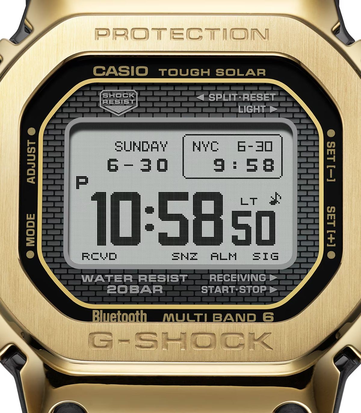 Orologio G-Shock della linea 5000 caratterizzato da una nuova struttura che estende la cassa fino alle anse per attenuare ulteriormente la trasmissione agli urti. Una protezione interna in resina si deforma temporaneamente per assorbire gli urti, ottenendo un orologio con l'esterno completamente in metallo. La cassa in titanio e la parte posteriore della cassa con chiusura a vite garantiscono una tenuta ermetica.