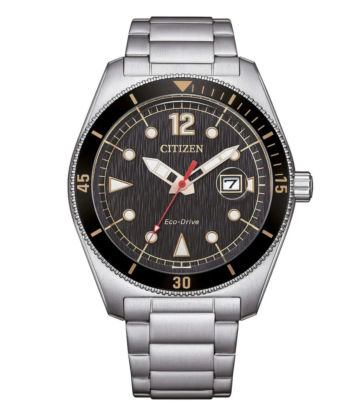 Cassa in acciaio da 43 mm con quadrante grigio e ghiera girevole bidirezionale, fondello a vite. Cinturino in acciaio e impermeabilità fino a 10 atm. Vetro Minerale.