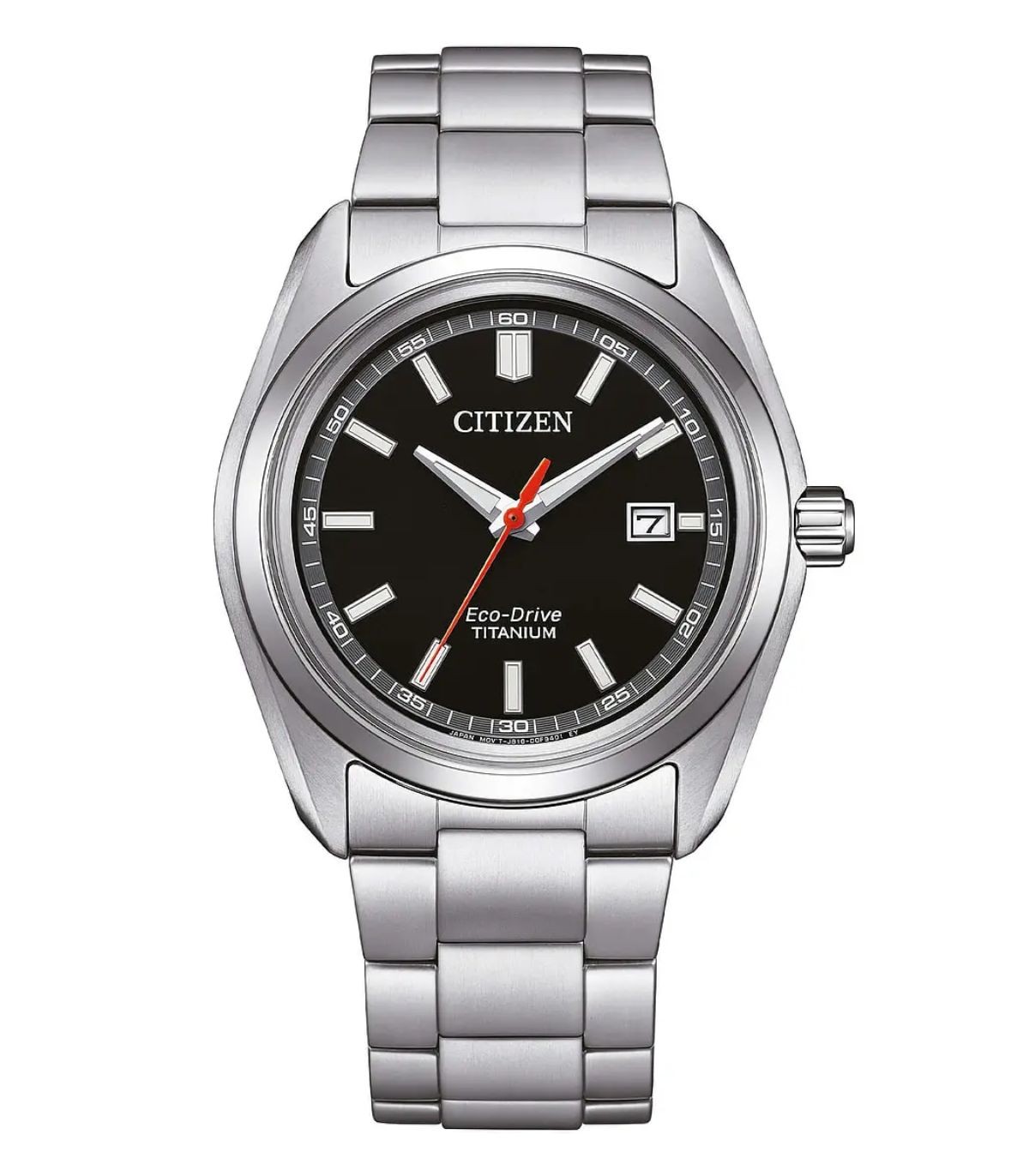 Orologio realizzato in super titanio con cassa da 40mm, quadrante nero e chiusura con pulsante di sicurezza. Il movimento Eco-drive a carica solare.