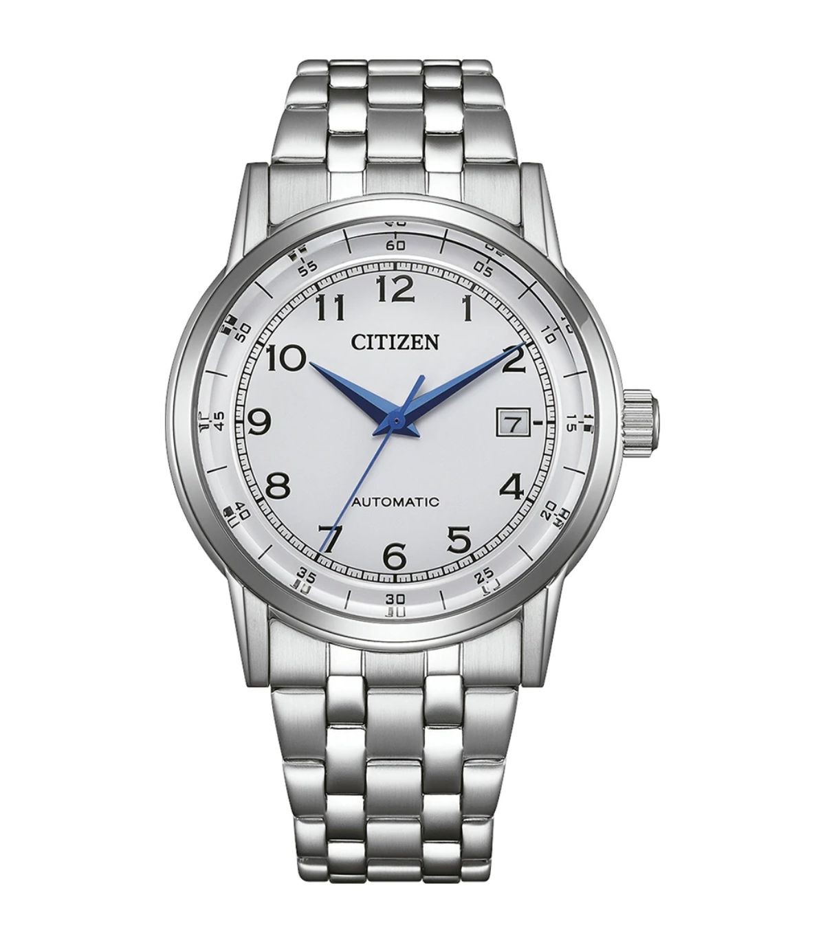 Orologio Citizen Automatic con cassa dal diametro 40 mm, quadrante bianco con lancette di colore blu. Cinturino in acciaio, con chiusura ad ardiglione.
