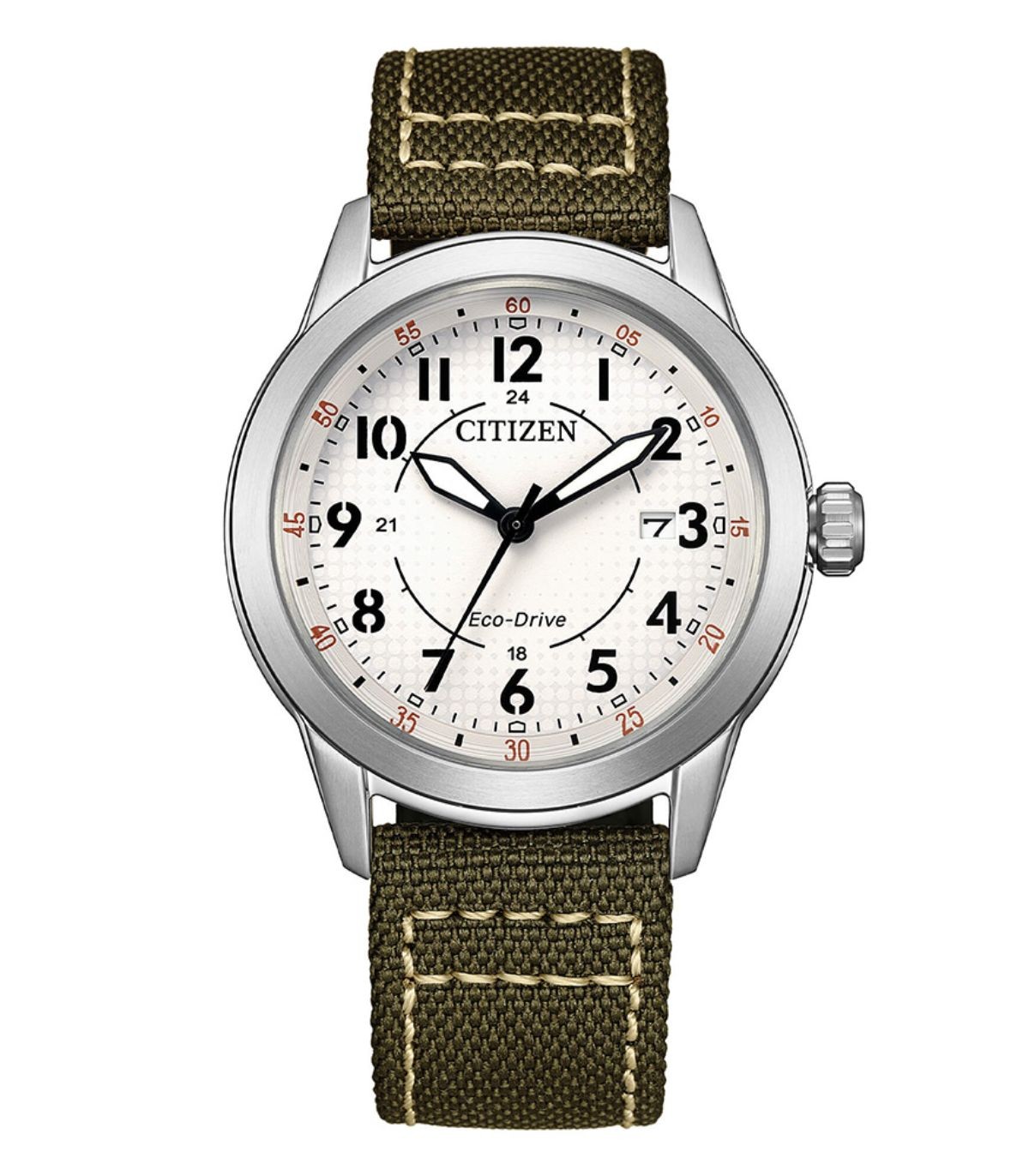 Orologio della collezione Of Collection Field, con cassa da 40 mm e cinturino in tessuto verde. Il quadrante di colore bianco è caratterizzato da una texture puntinata. Il movimento Eco-Drive trasforma ogni fonte di luce in energia, garantendo un'autonomia di 270 giorni senza necessità di batteria. Impermeabile fino a 10 atm con fondello a vite.