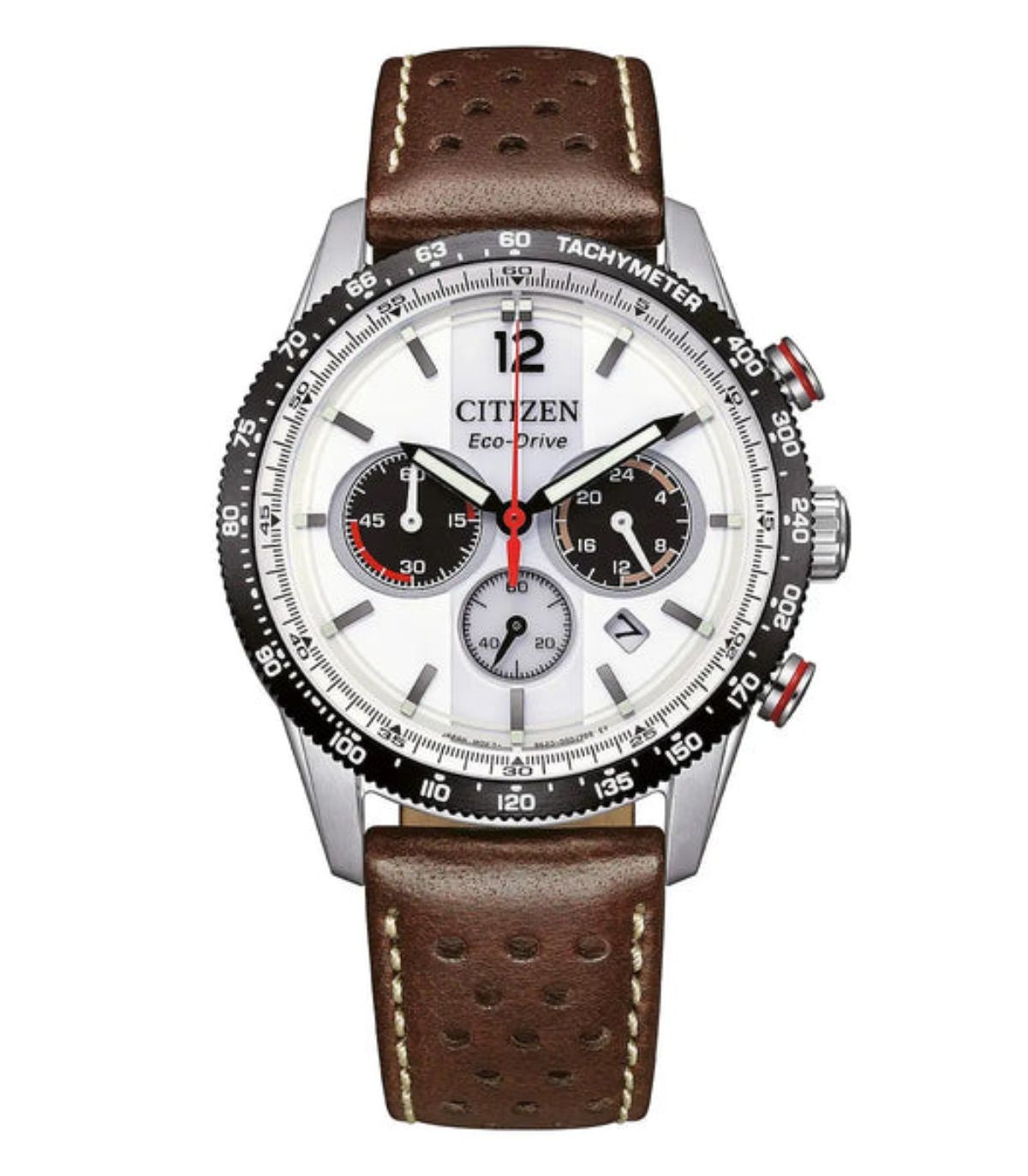 Cassa da 39 mm e cinturino in pelle marrone, quadrante bianco a righe ispirato ai circuiti storici. Il movimento Eco-Drive garantisce una riserva di carica fino a 270 giorni. Impermeabile fino a 10 atm con fondello a vite.