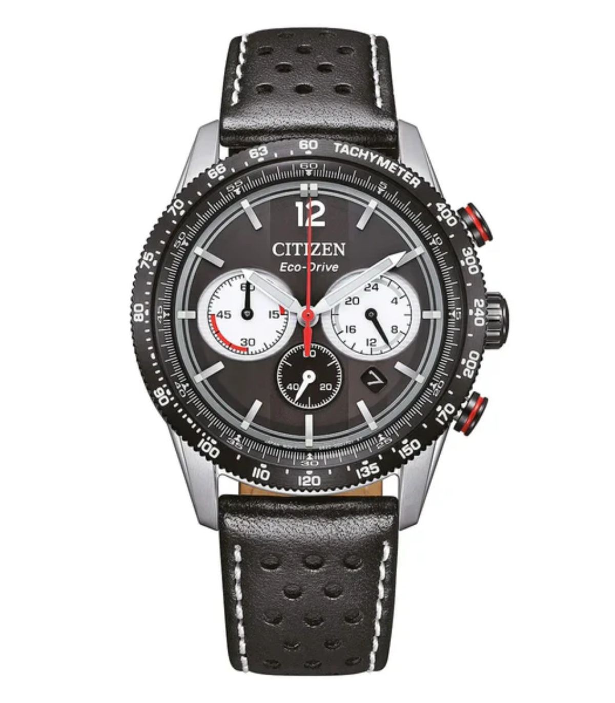 Cassa da 39 mm e cinturino in pelle nera, quadrante nero e dettagli rosso e bianco che evocano il dinamismo delle piste. Il movimento Eco-Drive garantisce una riserva di carica fino a 270 giorni. Impermeabile fino a 10 atm con fondello a vite.