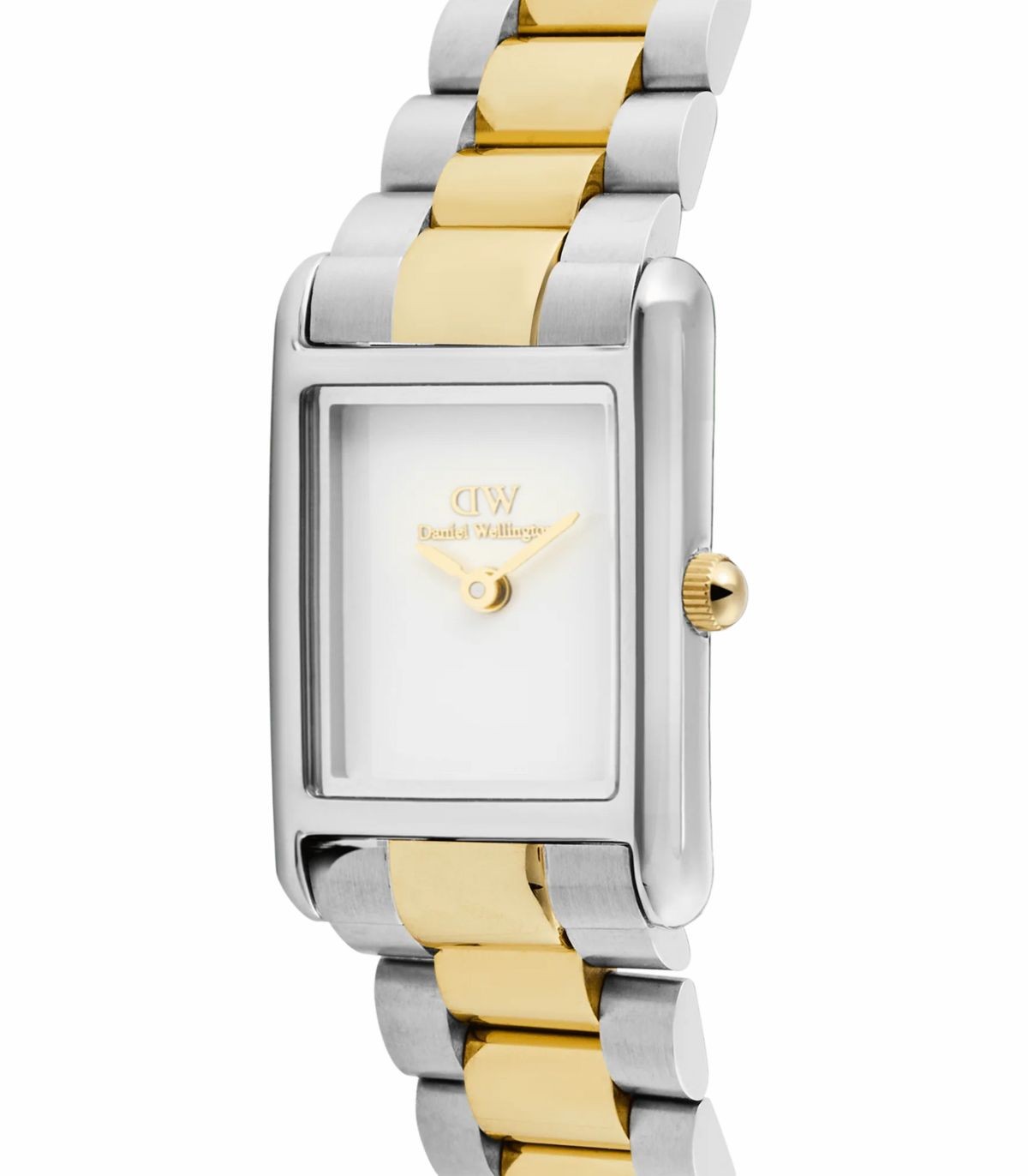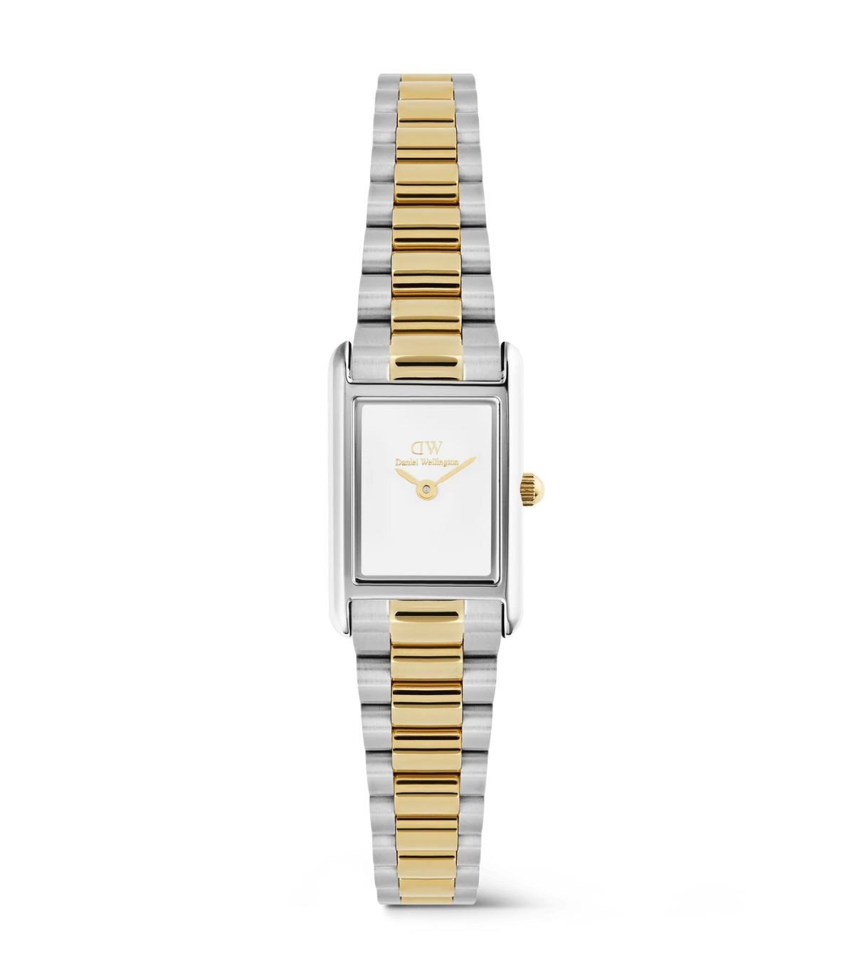 Orologio solo tempo di Daniel Wellington della collezione Bound Mini. Cassa rettangolare da 17x25,9mm e quadrante bianco. Il bracciale bicolore a tre maglie oro e argento aggiunge un sottile contrasto e si abbina bene a gioielli in oro e in argento.