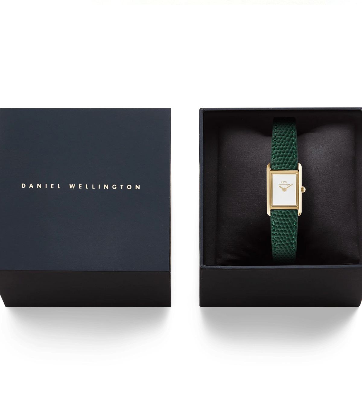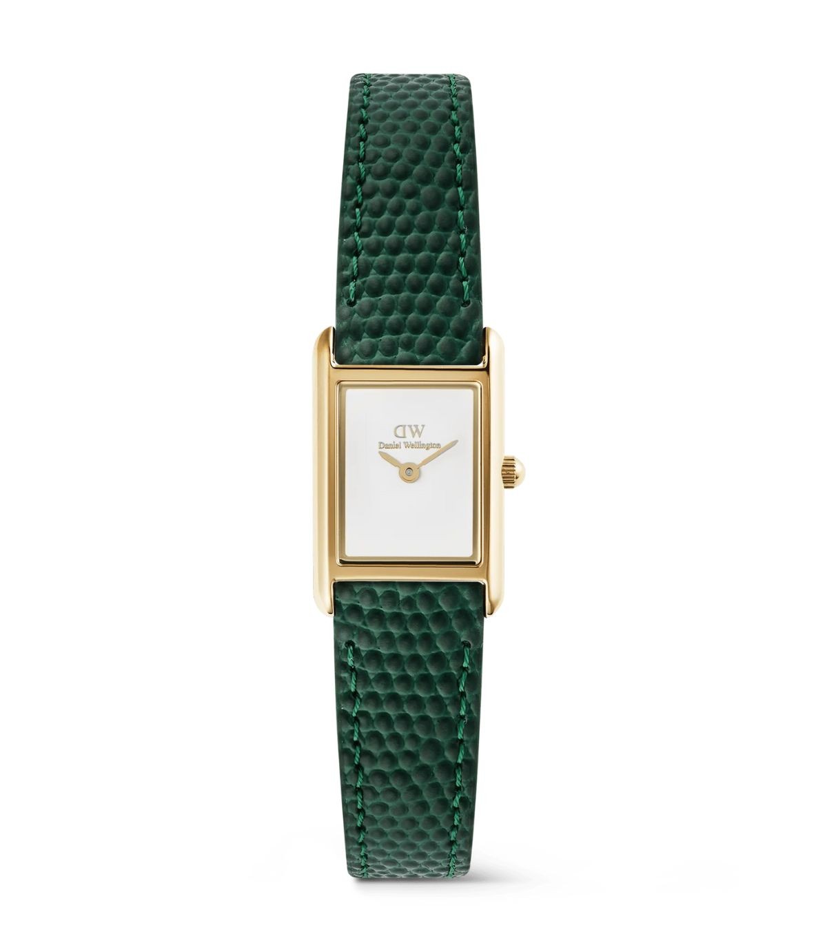 Orologio solo tempo di Daniel Wellington della collezione Bound Mini. Cassa rettangolare da 17x25,9mm e quadrante bianco. Cinturino in pelle verde per un look equilibrato e moderno.