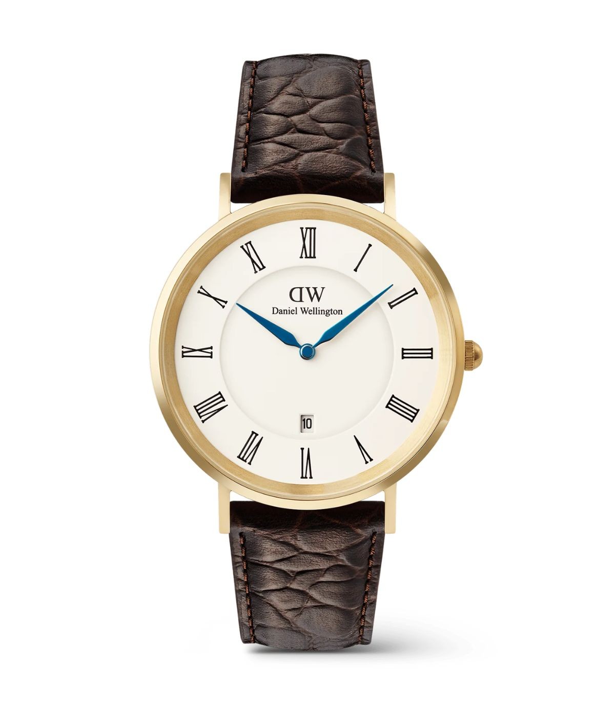 Orologio da Uomo di Daniel Wellington della collezione Roman Numerals. Cassa tonda in acciaio dorato da 40 mm e quadrante bianco, con numeri romani e indici di colore blu. Cinturino in pelle Croc Belly marrone scuro, leggermente imbottito e affusolato per il massimo comfort. Chiusura ad ardiglione.