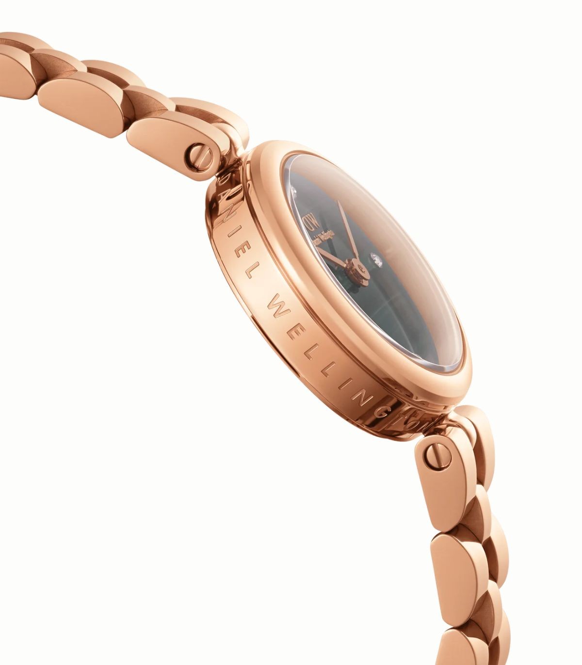 Orologio solo tempo di Daniel Wellington della collezione Elan Lumine. Cassa ovale da 22 mm. Cinturino in acciaio PVD oro rosa con tre maglie e quadrante verde impreziosito da cristalli bianchi.
