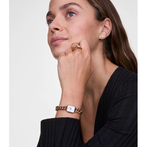 Orologio con cassa quadrata, quadrante di colore bianco. Cinturino in acciaio inossidabile con laccatura PVD rosé.