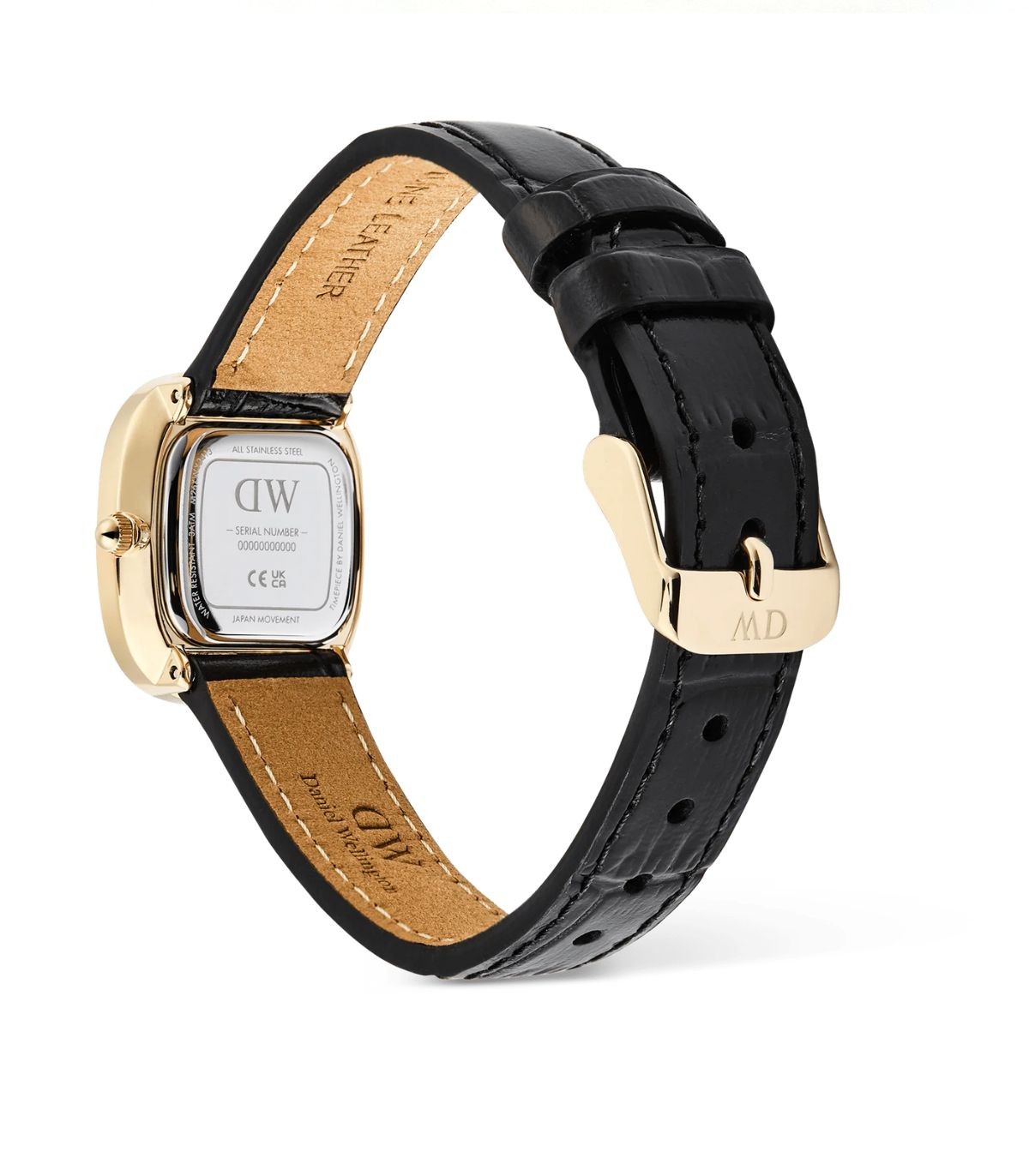 Orologio solo tempo da Donna di Daniel Wellington. Cassa quadrata da 24 mm in acciaio inossidabile con PVD placcato oro. Cinturino in pelle di coccodrillo nera e chiusura con fermaglio di sicurezza. Quadrante color nero e vetro minerale.
