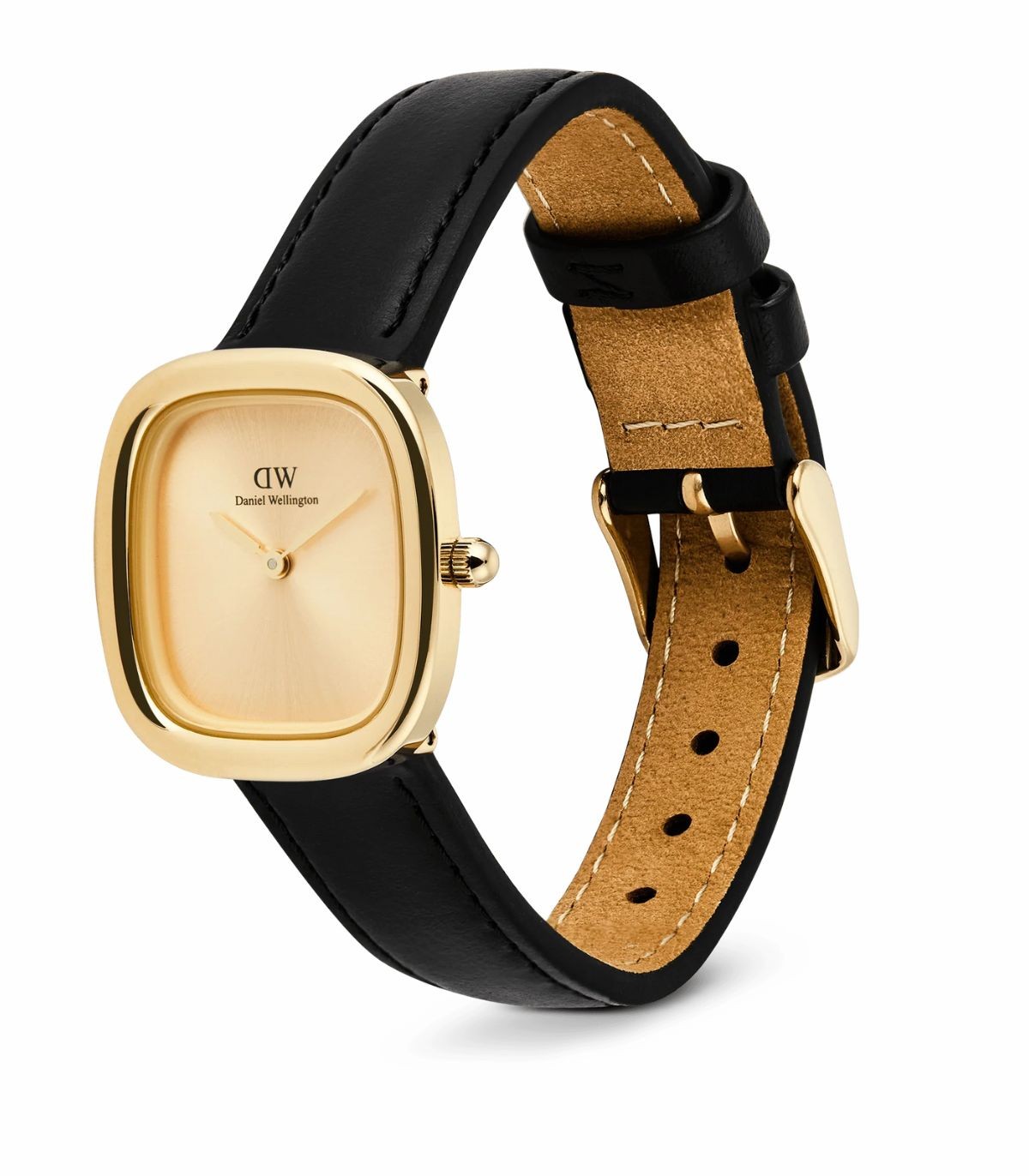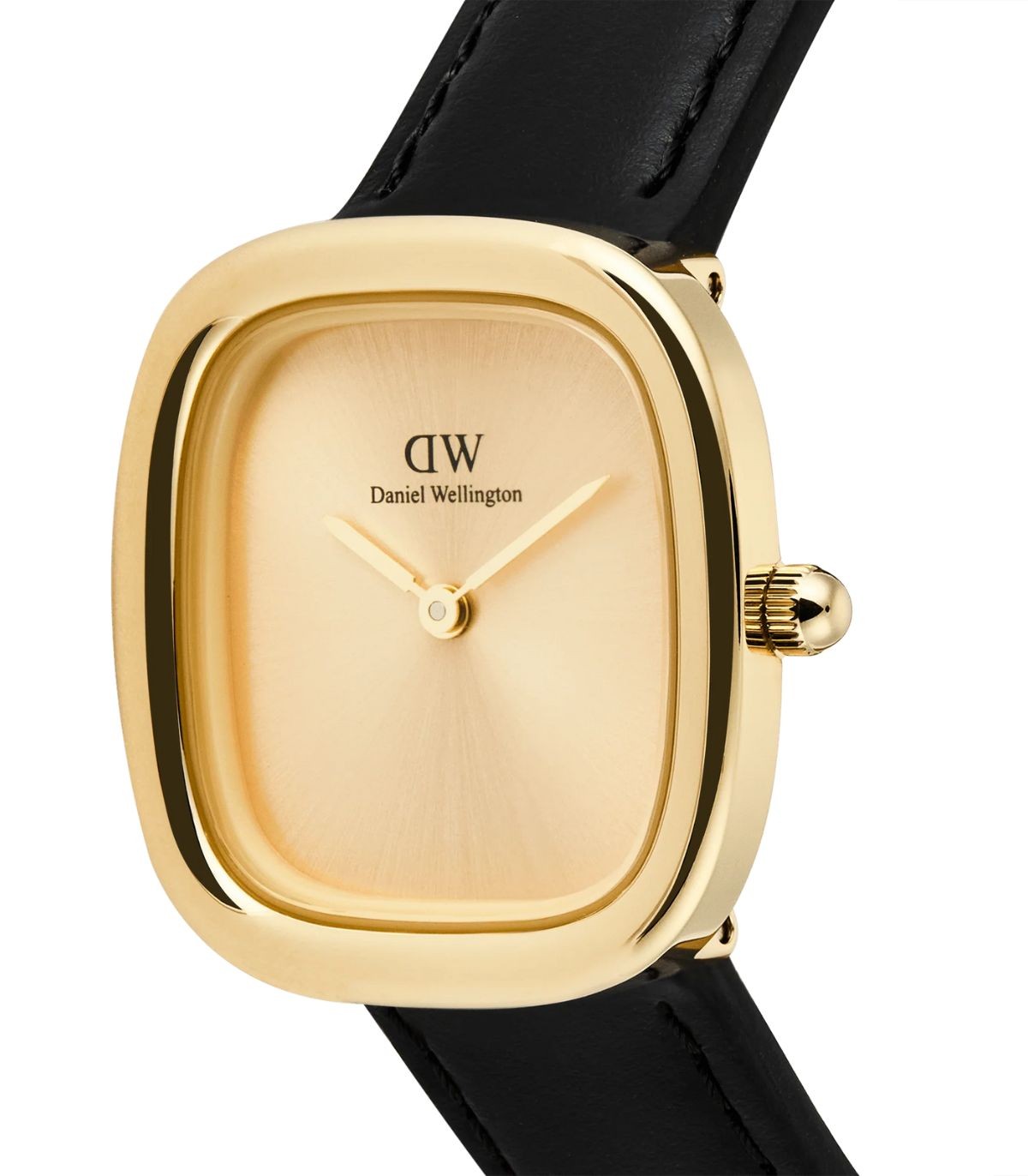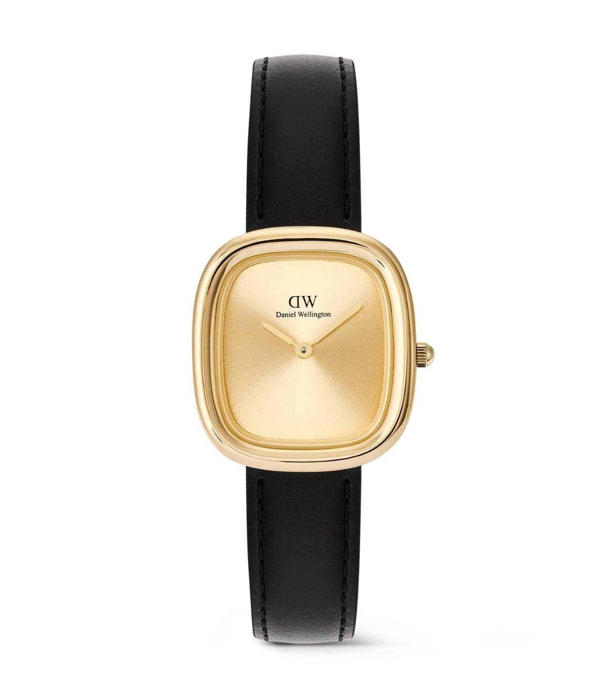 Orologio solo tempo da Donna di Daniel Wellington. Cassa quadrata da 24 mm in acciaio inossidabile con PVD placcato oro. Cinturino in pelle di coccodrillo nera e chiusura con fermaglio di sicurezza. Quadrante color nero e vetro minerale.