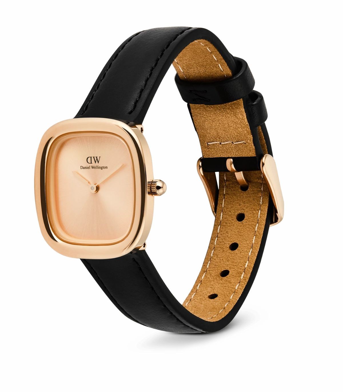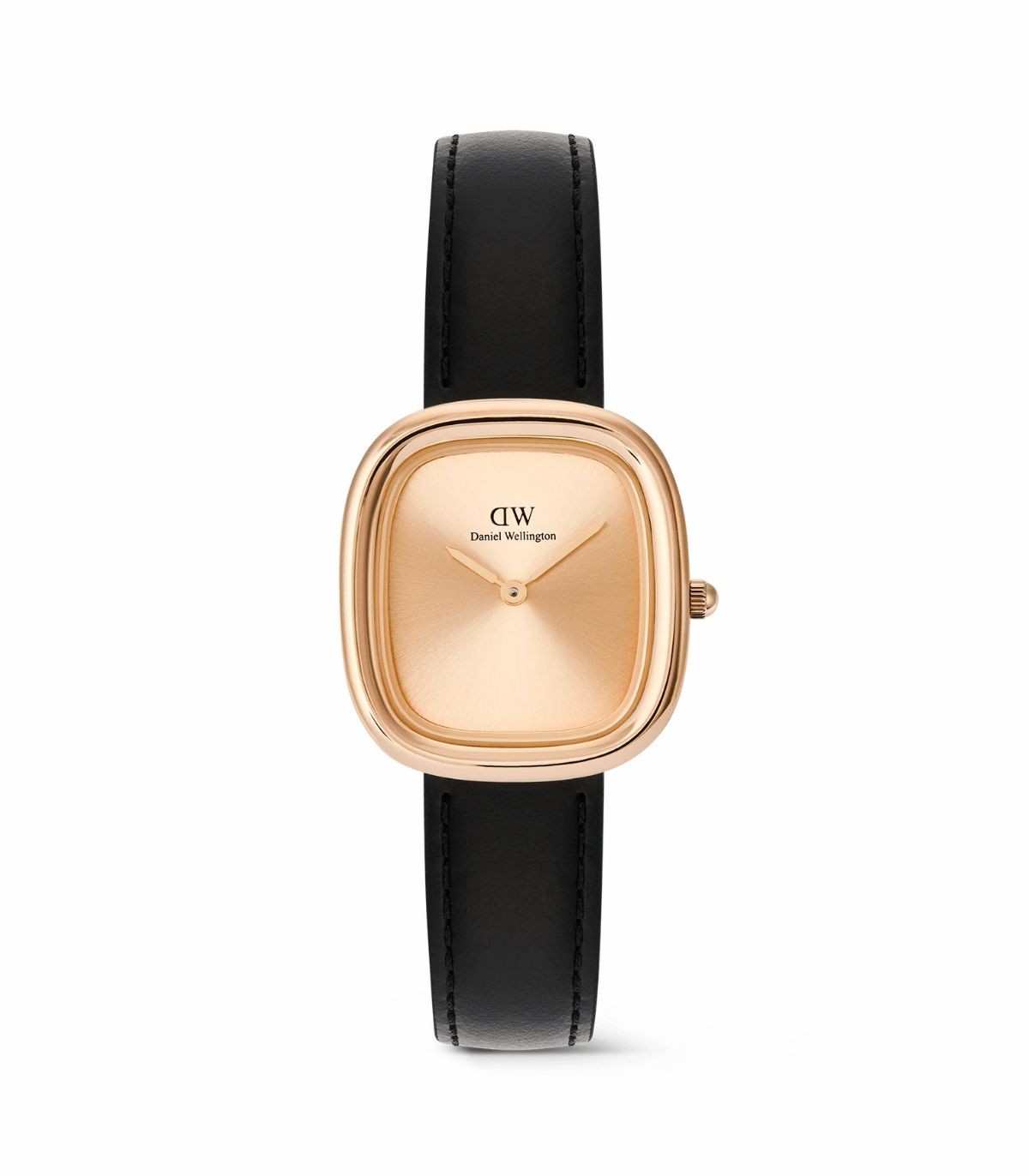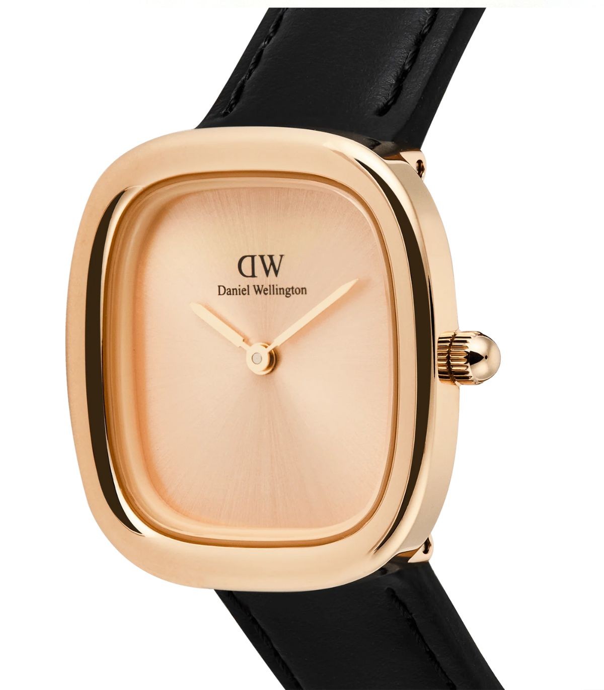 Orologio solo tempo da Donna di Daniel Wellington. Cassa quadrata da 24 mm in acciaio inossidabile con PVD placcato oro rosato. Cinturino in pelle nera e chiusura con fermaglio di sicurezza. Quadrante color oro rosato e vetro minerale.