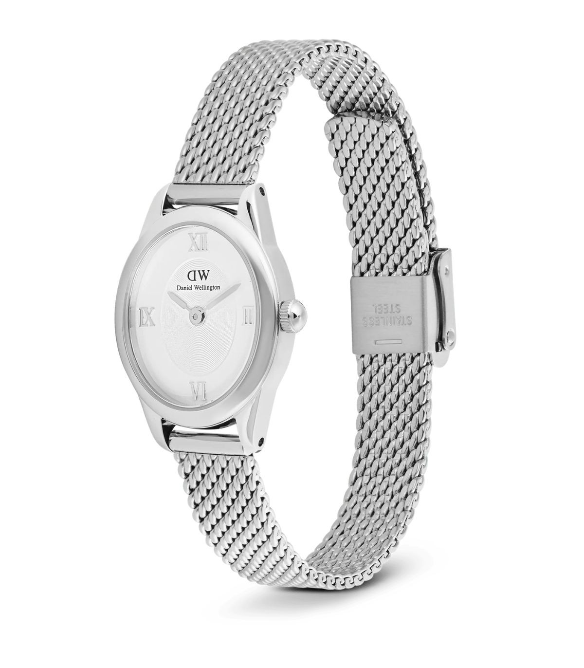 Orologio solo tempo da Donna di Daniel Wellington, caratterizzato da un elegante quadrante ovale che si discosta dagli orologi tradizionali. Quadro bianco, con due lancette e numeri romani in metallo. Il cinturino a maglia fine è in acciaio inossidabile con finitura lucida. Chiusura con fibbia pieghevole.
