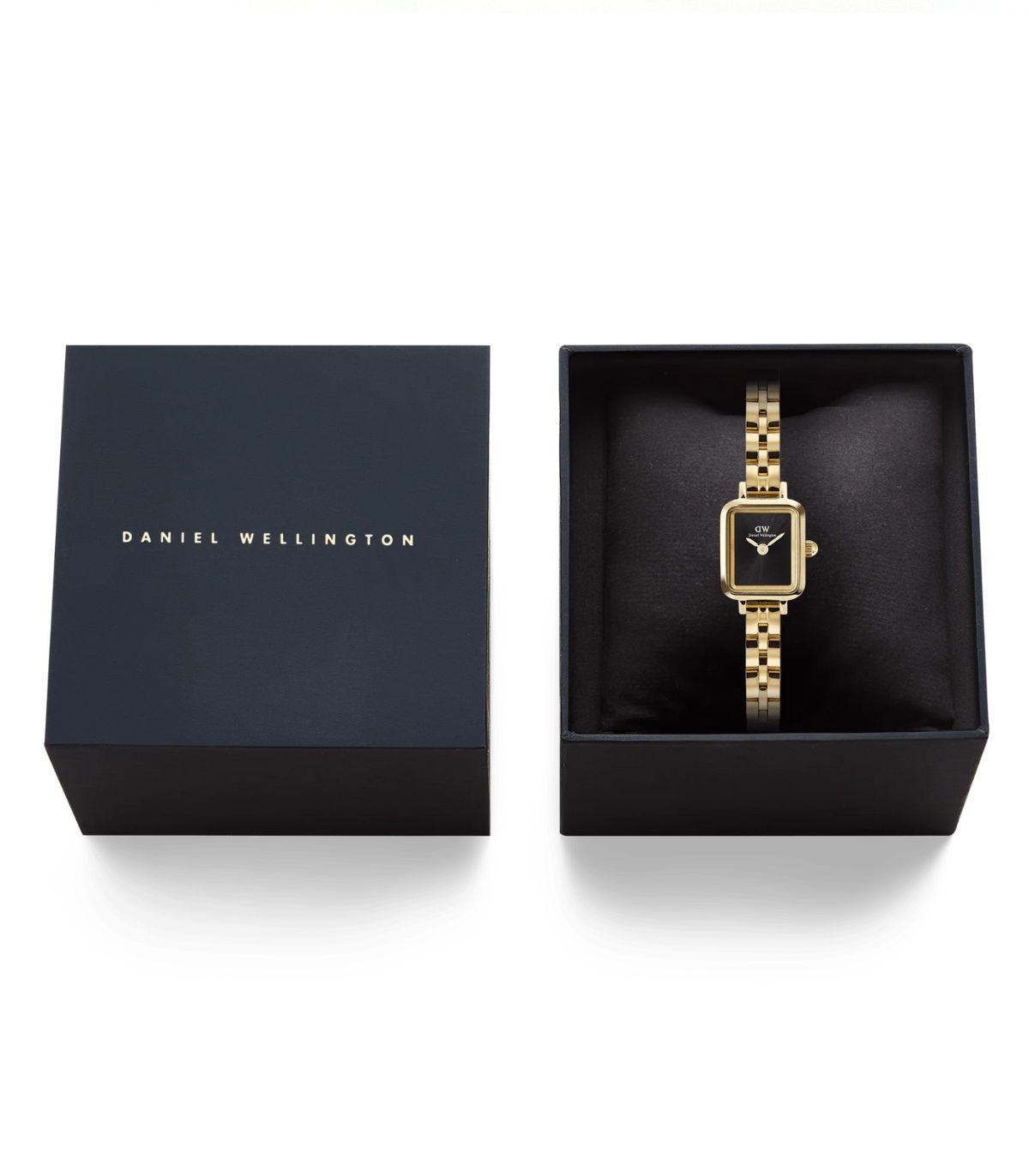 Orologio solo tempo da Donna di Daniel Wellington della collezione Quadro Mini. Quadro di colore nero e due indici per un look minimalista, da 18,2 mm. Cassa e cinturino in acciaio inossidabile con PVD placcato in oro, vetro minerale.