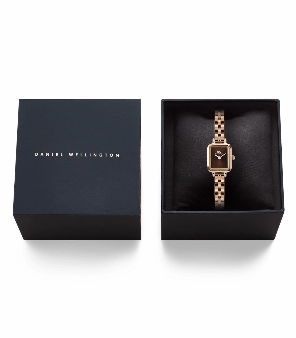 Orologio solo tempo da Donna di Daniel Wellington della collezione Quadro Mini. Quadrante di colore marrone e due indici per un look minimalista, da 18,2 mm. Cassa e cinturino in acciaio inossidabile con PVD placcato in oro rosa, vetro minerale.
