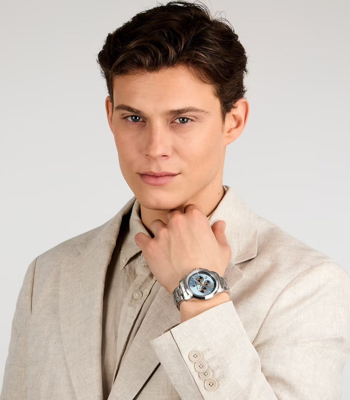 Orologio con cassa in acciaio da 42 mm. Il vetro minerale protegge il quadrante analogico di colore celeste. Il cinturino in metallo presenta una chiusura deployante con pulsanti. Impermeabile fino a 5 Atm.