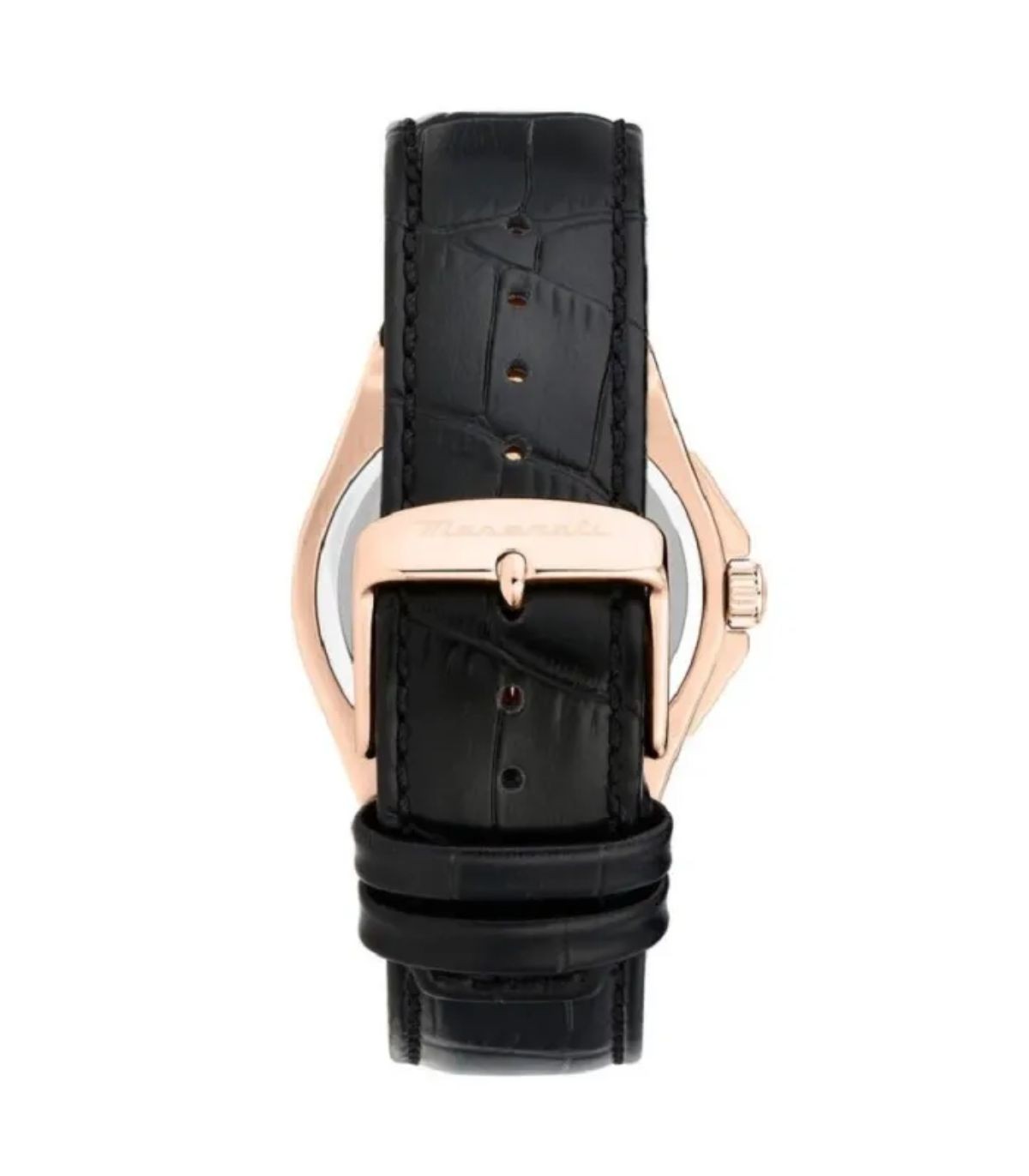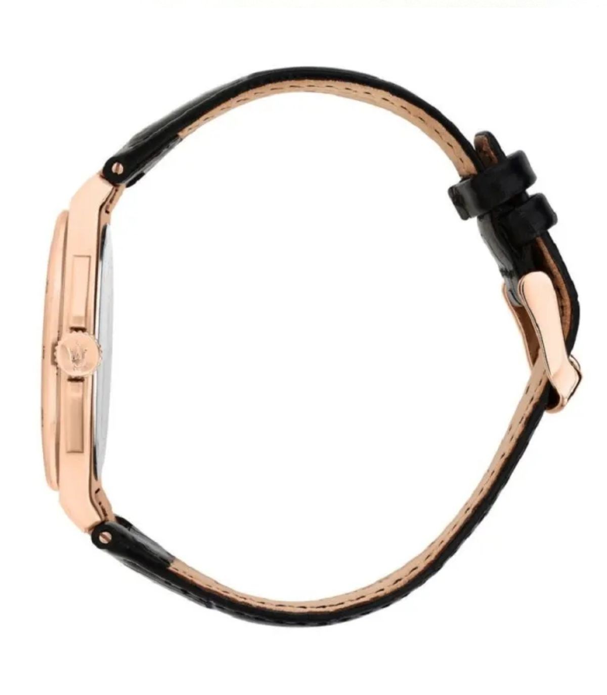 Orologio con cassa in acciaio inox PVD rose gold, dal diametro di 40 mm, lunetta con numeri arabi di colore nero e cinturino in pelle nera. Quadrante analogico di colore nero con datario con finestrella a ore 3. La chiusura ad ardiglione in acciaio PVD rose gold. Vetro minerale e impermeabile fino a 5 Atm.