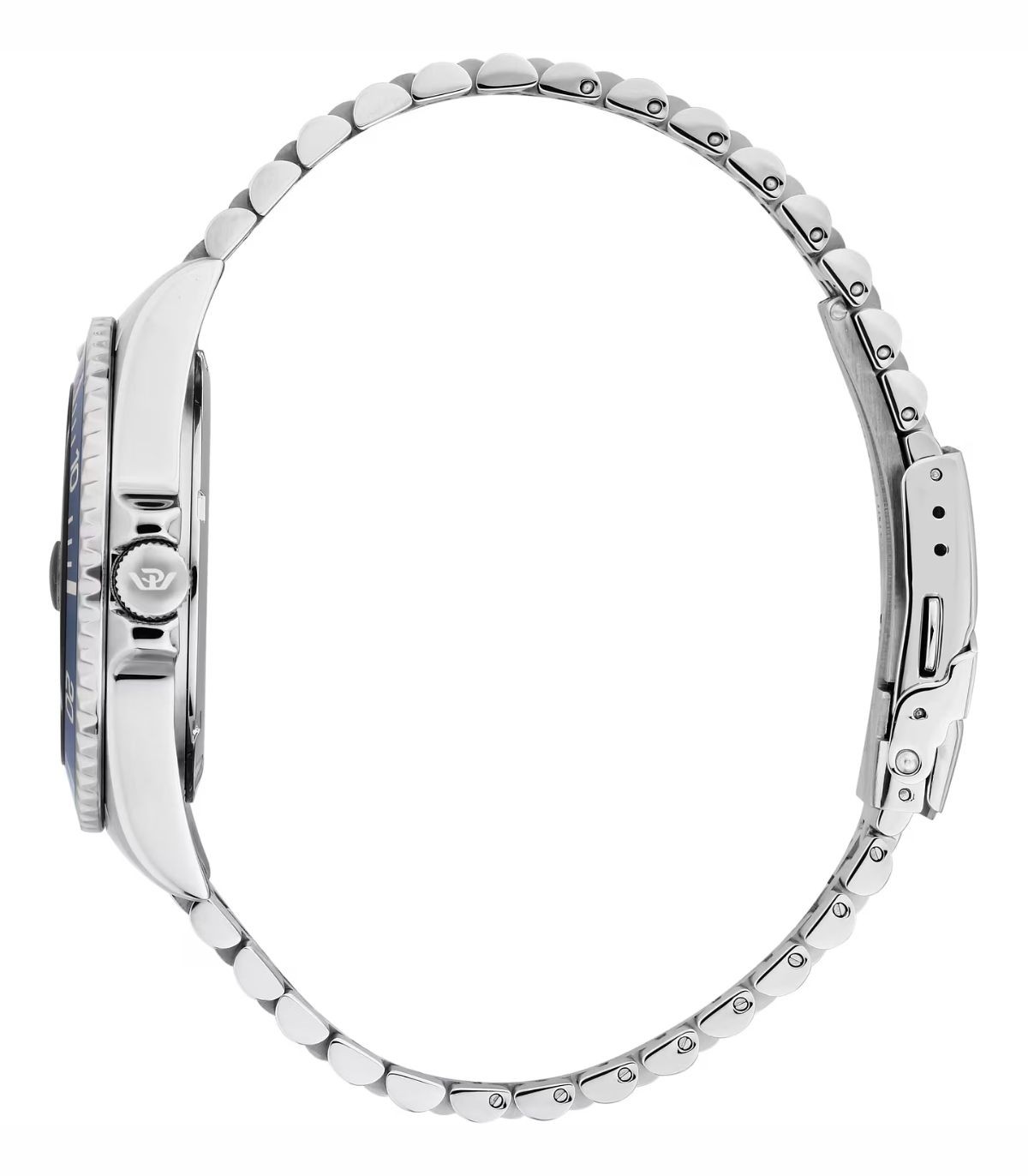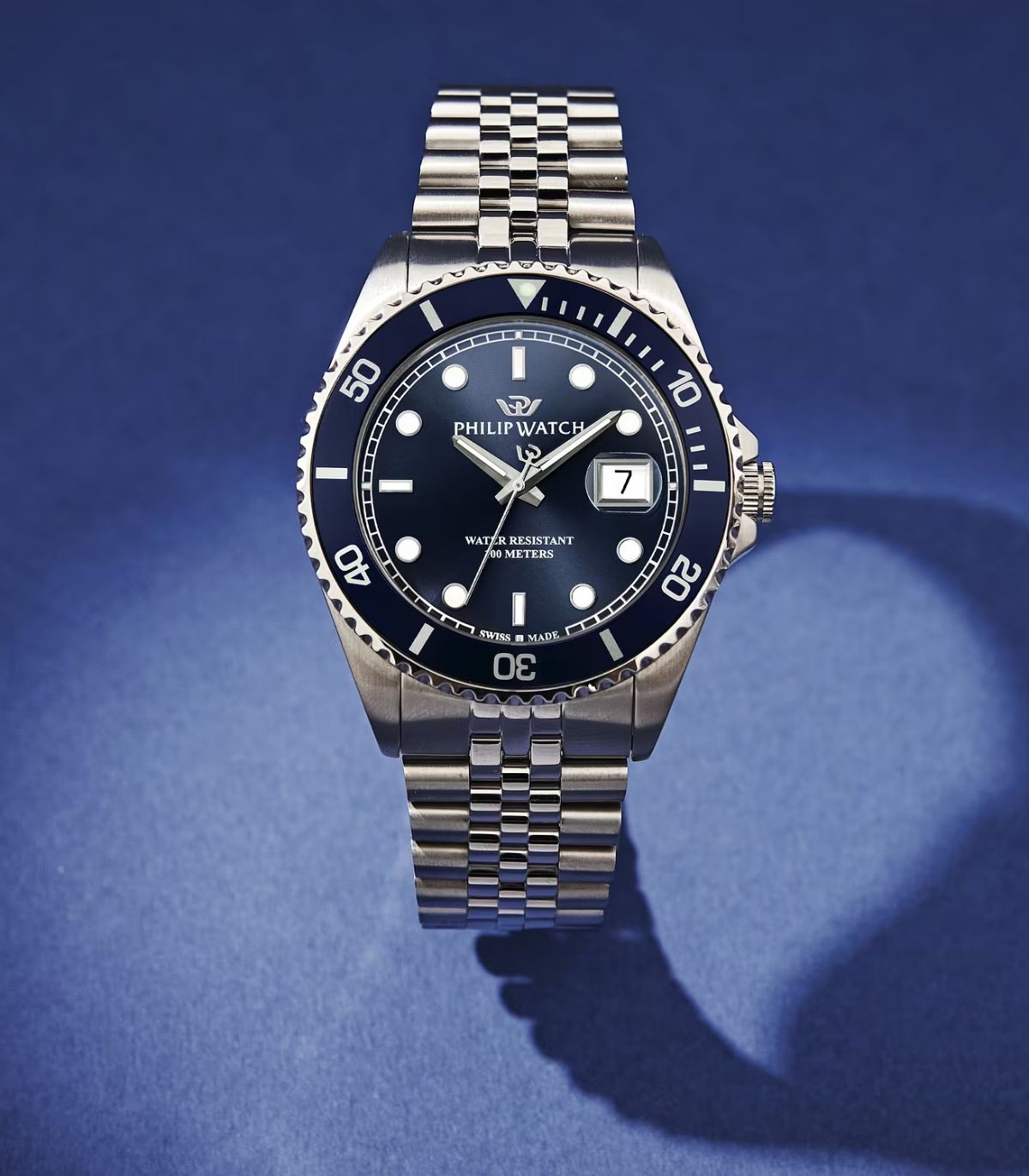 Orologio Solo Tempo Philip Watch collezione Caribe Sport. Cassa in acciaio con quadrante blu e finitura satinata. Cinturino in metallo e chiusura deployante con pulsanti di sicurezza.