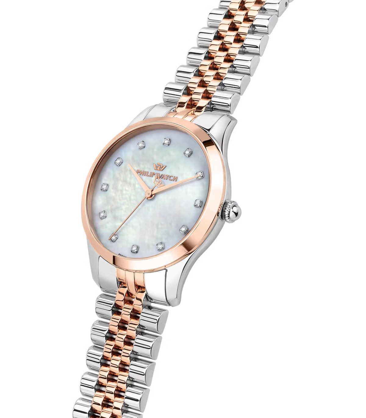 Orologio Philip Watch della collezione Grace. Cassa in acciaio con quadrante in madreperla, impreziosito da cristalli bianchi. Cinturino bicolore in acciaio color argento e rosé, chiusura fibbia deployante con pulsanti.