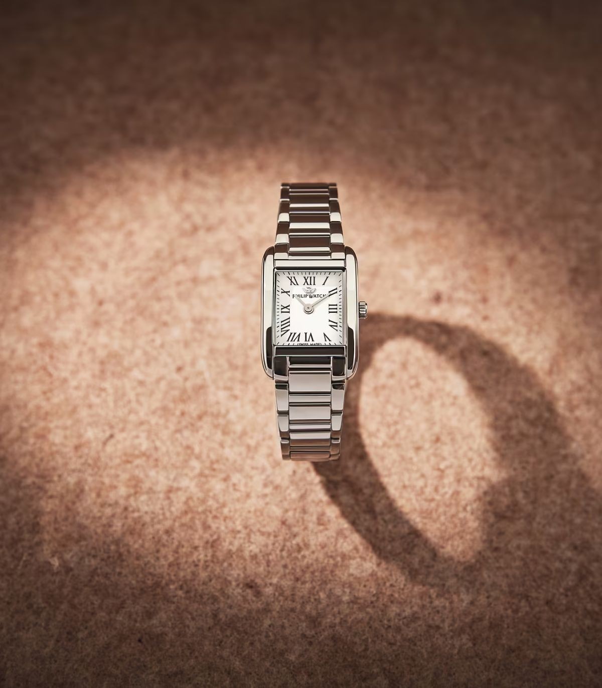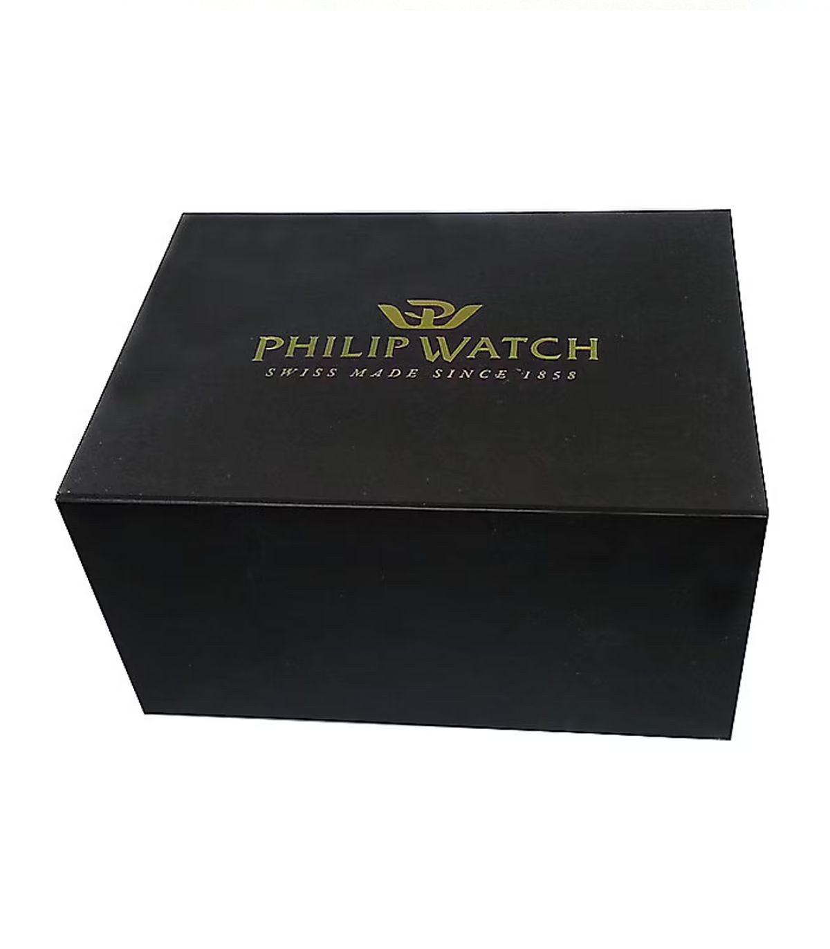 Orologio solo tempo Philip Watch collezione Museum. Cassa in acciaio con quadrante bianco, indici e lancette nere. Cinturino in acciaio e chiusura con fibbia farfalla con pulsanti.
