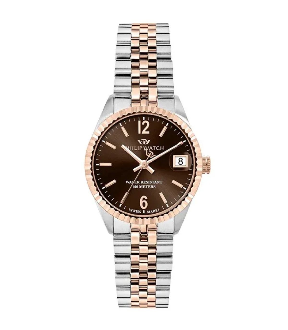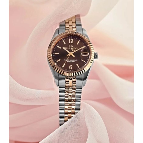 Orologio Solo Tempo Philip Watch collezione Caribe. Cassa in acciaio inox con quadrante analogico chocolate e datario. Cinturino in metallo con finitura lucida e inserto centrale in PVD rose gold. Chiusura con fibbia farfalla con pulsanti.