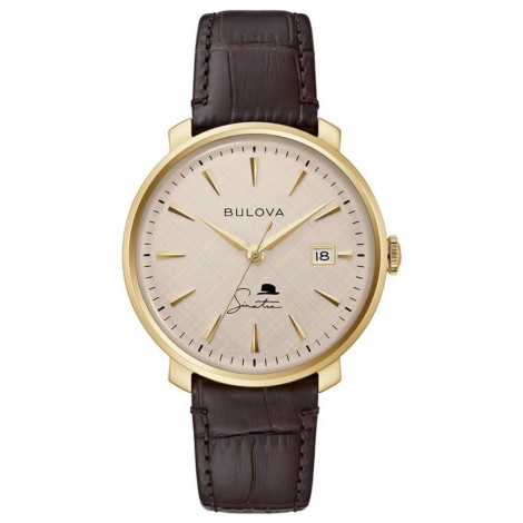 Orologio da Uomo di Bulova, collezione dedicata a Frank Sinatra. Orologio solo tempo, movimento meccanico. Cassa in acciaio diametro 40mm e finitura in acciaio placcato oro, vetro zaffiro e cinturino in pelle marrone. Fibbia deployante con pulsanti, quadrante analogico di colore beige. Impermeabilità all'acqua 30M;