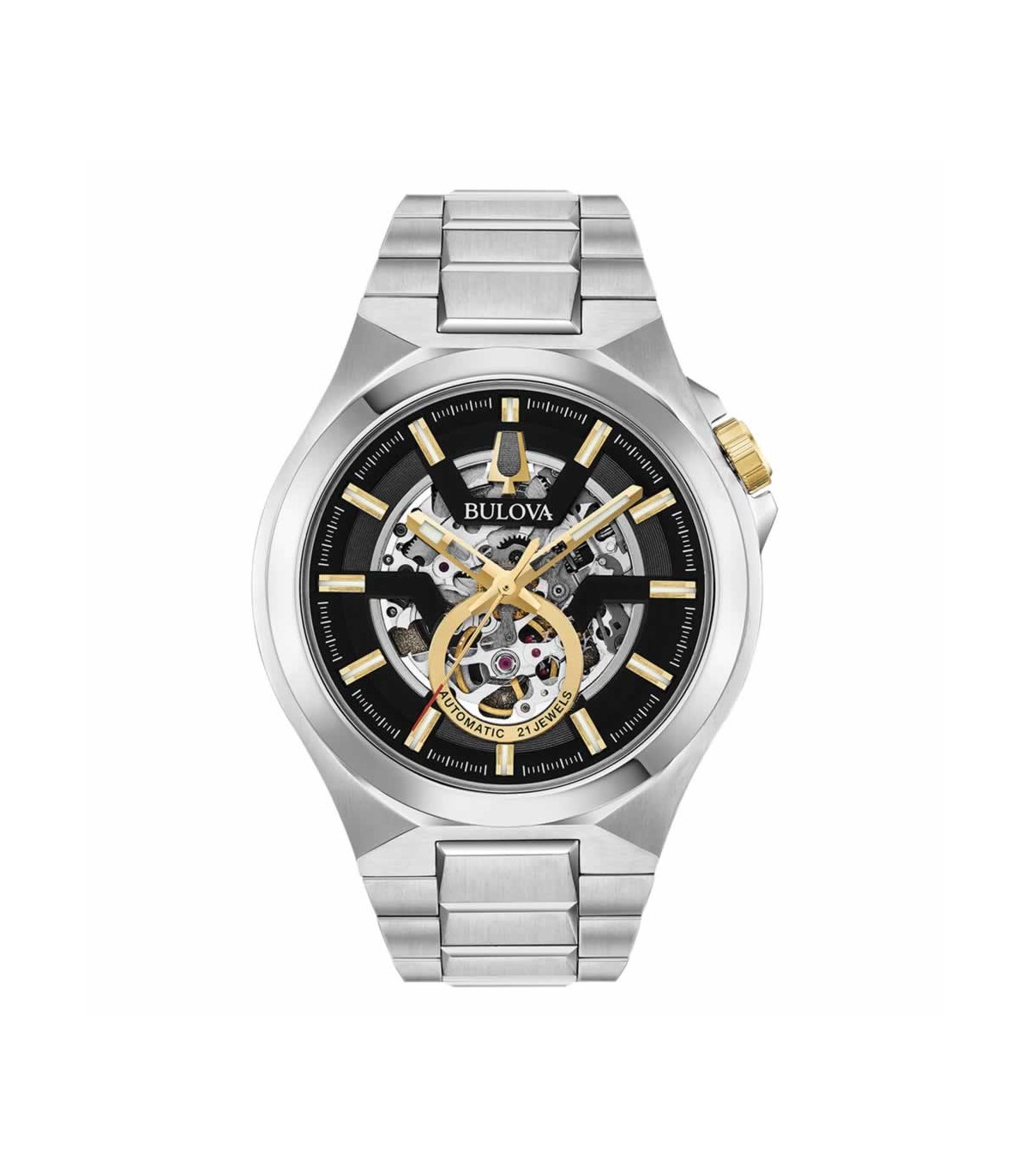 Orologio Bulova Automatico Cronografo da Uomo, collezione Maquina. Questo orologio Bulova ha una cassa in acciaio inox con un diametro di 46 mm ed è dotato di un cinturino in Metallo. Quadrante nero, con indici colore oro. Fondello a vite con oblò trasparente e movimento a vista con vetro di tipo Zaffiro. Fibbia deployante, quadrante analogico. L'orologio è impermeabile a 10ATM.